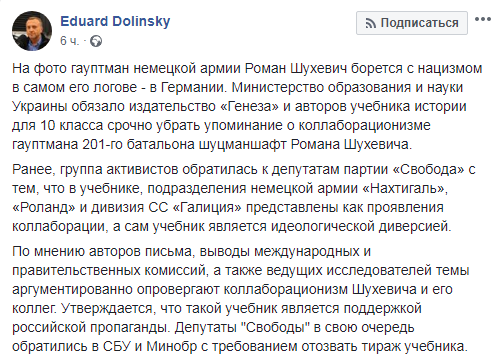 По его словам, ранее группа активистов обратилась к депутатам партии "Свобода" с тем, что в учебнике, подразделения немецкой армии "Нахтигаль", "Роланд" и дивизия СС "Галиция" представлены как проявления коллаборации. Ссылаясь на "выводы международных и правительственных комиссий, а также ведущих исследователей темы", активисты заявили, что Шухевич не был коллаборационистом, а сам учебник "является поддержкой российской пропаганды".