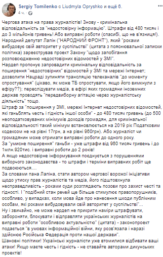 Уважаемые политики! Украинские журналисты уже устали отражать ваши атаки! Если у вас есть честь и достоинство - не становитесь авторами дикарских проектов!"- написал в соцсети глава НСЖУ Сергей Томиленко.
