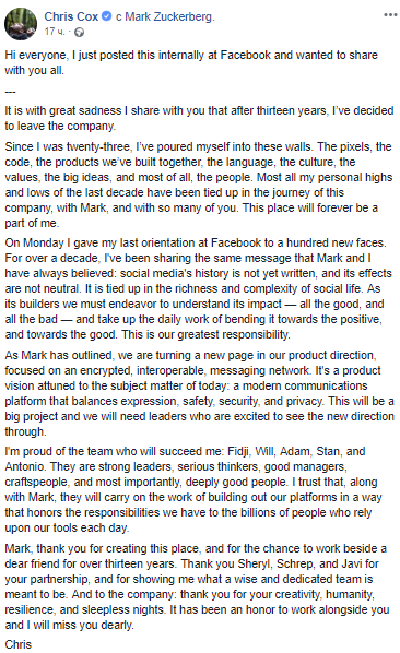 Крис Кокс является одним из ключевых сотрудников Facebook. В посте о своей отставке он отметил, что благодарен председателю Facebook Марку Цукербергу за работу в компании, но причину своего увольнения он не назвал.