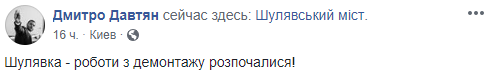 В Киеве на Шулявском путепроводе, 18 марта, начались работы по демонтажу многострадального моста. Об этом сообщил заместитель председателя КГГА Дмитрий Давтян на своей странице в Facebook.