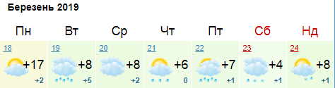 Ресурс Мeteoprog.ua показывает 18 марта тепло до +16. Потом похолодает до +7...+10. Во вторник, четверг и субботу возможен дождь.