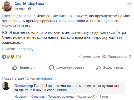 Но уверен - президентом Украины должен быть украинец и христианин. Как абсолютное большинство украинцев. Поэтому я не буду голосовать ни за Тимошенко, ни за Зеленского. Ни других ставленников иностранных олигархов. P. S. Сергей Щербина манипулятивно передернул и спросил, а как же Гройсман. Отвечаю: Гройсман - политический украинец. Я ему не заглядывал в душу, но мне кажется, что он хочет добра Украине. Вообще, по-моему, украинцы - это люди всех наций и народов, которые любят Украину. Как только ты полюбил Украину, ты стал украинцем. Поэтому, конечно, не является украинцем человек, изменяющий Украине с Путиным или тот, кто называет ее актрисой немецких порнофильмов", - написал Александр Палий.