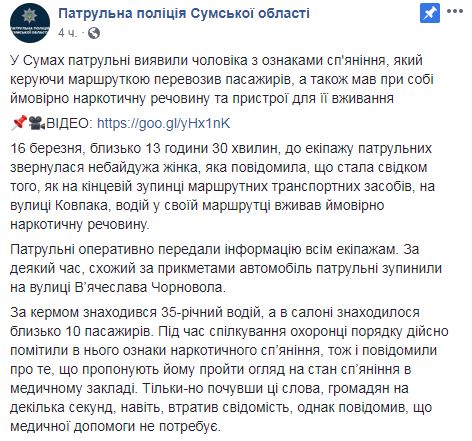 В Сумах водитель маршрутки перевозил пассажиров предположительно находясь в состоянии наркотического опьянения. Об этом в понедельник, 18 марта, сообщает пресс-служба патрульной полиции Сумской области в Facebook.