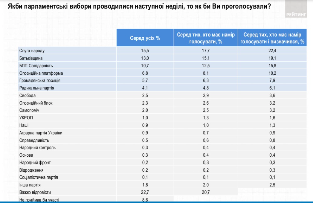 "Батькивщину" Юлии Тимошенко поддерживают - 19,1%, "БПП Солидарность" - 15,8%, "Оппозиционную платформу - За жизнь" (Юрий Бойко и Вадим Рабинович) 10,2%, "Гражданскую позицию" Анатолия Гриценко - 7,9%, "Радикальную партию" Олега Ляшко - 6,1%.