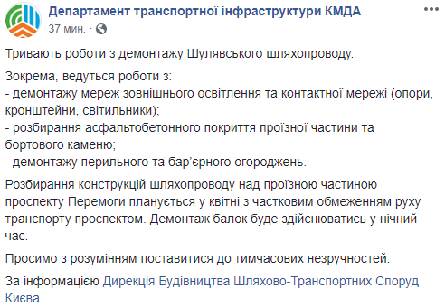 Во вторник, 19 марта, в Киеве продолжаются ремонтные работы по демонтажу Шулявского путепровода. Некоторые работы ведутся даже в ночное время, что создает неудобства для водителей и жителей близлежащих квартир. Об этом сообщает пресс-служба департамента транспортной инфраструктуры КГГА в Facebook.