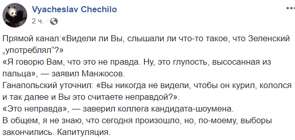 "Манжосов пришел на "Прямой". Ганапольский пытался выжать из него грязь. Жалкое зрелище. Бывший друг Зеленского дал понять, что вопросы ведущий задает некорректные, ничего плохого о своих бывших друзьях он говорить не собирался и не будет. А еще никакой Зеленский не наркоман. Единственное – не видит Зеленского президентом именно в это время.