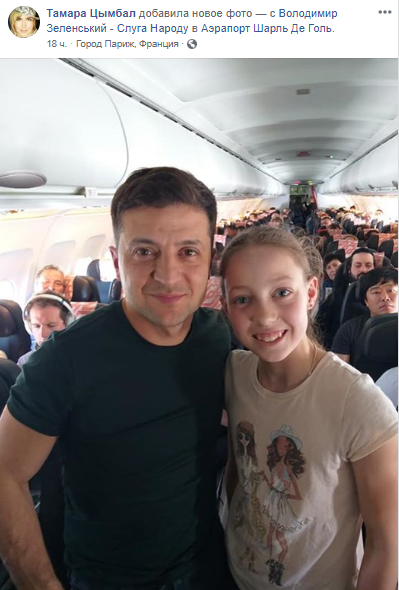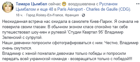 "Неожиданная встреча нас ожидала в самолете Киев-Париж. Я сначала не поверила своим глазам. В обычном эконом классе спокойно так себе путешествовал шоу-мен и рулевой 'Студии Квартал 95' Владимир Зеленский с супругой. Наши девченки попросили сфотографироваться с ним. Честно, Владимир очень смутился. Владимир с женой пожелали девочкам только победы и попросили передать всей украинской команде - возвращаться только с победой!!!" - комментируют встречу пассажиры.