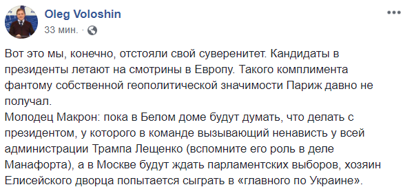 Молодец Макрон: пока в Белом доме будут думать, что делать с президентом, у которого в команде вызывающий ненависть у всей администрации Трампа Лещенко (вспомните его роль в деле Манафорта), а в Москве будут ждать парламентских выборов, хозяин Елисейского дворца попытается сыграть в "главного по Украине"", - пишет политолог-международник Олег Волошин.