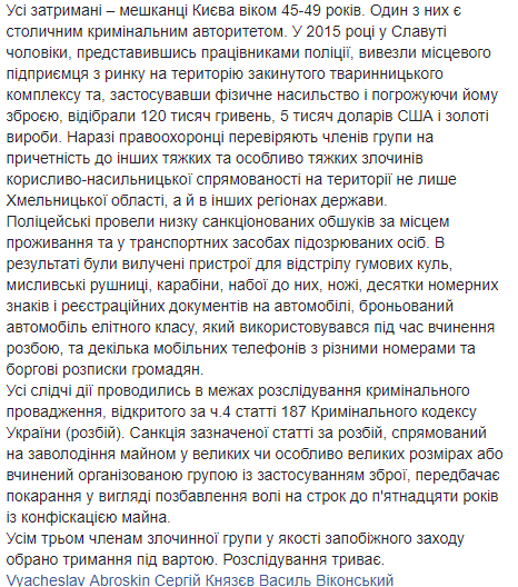 В сообщении полицейских говорится, что группа совершила разбой еще в 2015 году, но долгое время он оставался нераскрытым. Только с созданием в конце 2018 года в структуре Главного управления Нацполиции в Хмельницкой области управления стратегических расследований, которое специализируется на раскрытии тяжких и особо тяжких преступлений, совершенных организованными преступными группами, появились реальные шансы разоблачить и привлечь к ответственности опасных преступников. Для успешного документирования преступной деятельности и проведения спецоперации по задержанию подозреваемых в разбое лиц, которых разыскивали в течение 3 лет, работникам подразделения понадобилось всего несколько месяцев. Все задержанные - жители Киева в возрасте 45-49 лет. Один из них является столичным криминальным авторитетом.