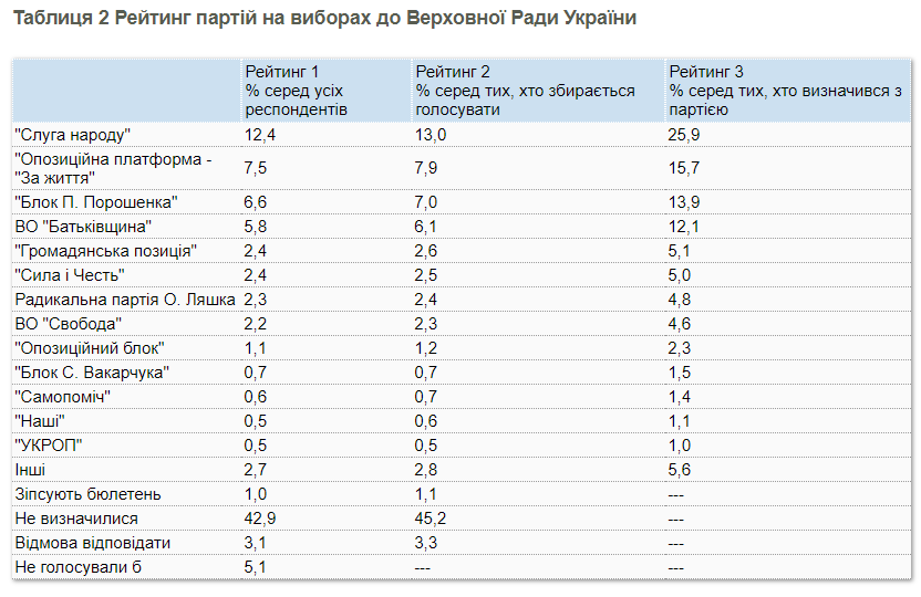 Согласно результатам опроса, за партию "Слуга народа" готовы проголосовать 12% всех респондентов и 26% среди тех, кто собирается голосовать и определился), за "Оппозиционную платформу –"За жизнь" - соответственно, 7.5% и 16%, "Блок Петра Порошенко" получил бы соответственно, 7% и 14%, ВО "Батькивщина" - соответственно, 6% и 12%), "Гражданская позиция" -2% и 5% , "Сила и честь" - 2% и 5%.