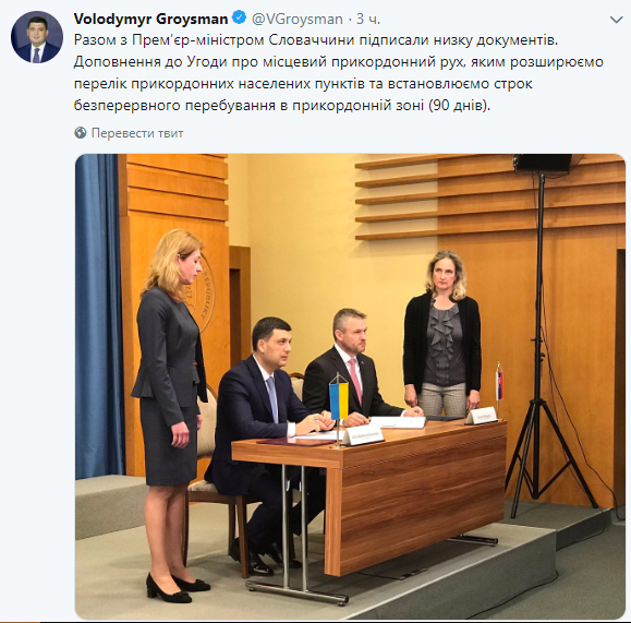 "С премьер-министром Словакии подписали ряд документов. Дополнение к соглашению о местном приграничном движении, которым расширяем перечень приграничных населенных пунктов и устанавливаем срок непрерывного пребывания в пограничной зоне (90 дней)", - написал он.