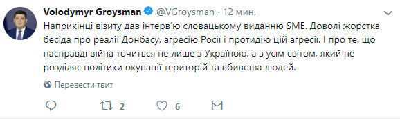 До этого премьер провел встречу с премьер-министром Словакии Петером Пеллегрини. Участники встречи также подписали Декларацию о намерениях заключить соглашение и определить условия использования части воздушного пространства Словакии для обслуживания воздушного движения украинским провайдером "Украэрорух" в международном аэропорту "Ужгород". В конце своего визита Владимир Гройсман дал интервью словацкому изданию SME. "Довольно жесткая беседа о реалиях Донбасса, агрессии России и противодействии этой агрессии. И о том, что на самом деле война идет не только с Украиной, а со всем миром, который не разделяет политики оккупации территорий и убийства людей", - написал политик на своей странице в Twitter.