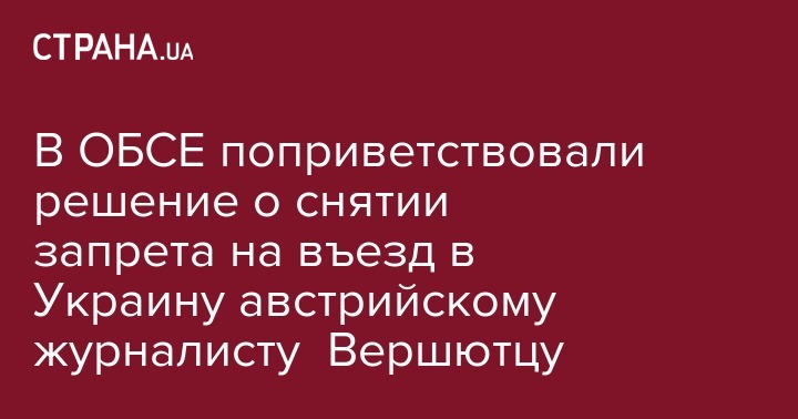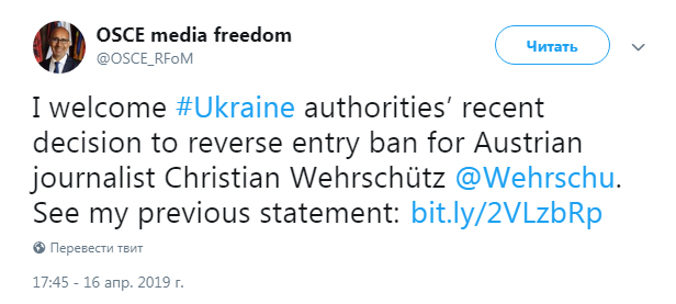 Представитель ОБСЕ по вопросам свободы СМИ Арлем Дезир приветствует отмену запрета на въезд в Украину австрийскому журналисту Кристиану Вершютцу. Об этом сказано в его заявлении в Twitter.