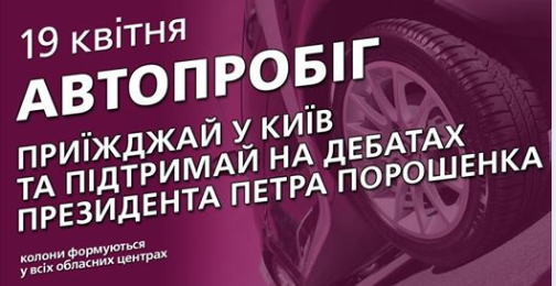 Также у Порошенко организовали автопробег в день дебатов. В созданном мероприятии в Facebook сообщается, что ожидается, что он стартует из каждого областного центра и финиширует в Киеве. А его участникам обещают место на стадионе во время дебатов.