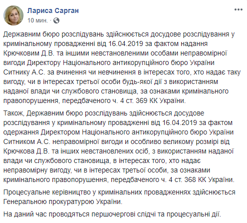 Государственным бюро расследований осуществляет досудебное расследование в уголовном производстве от 16 апреля по факту предоставления Дмитрием Крючковым и другими неустановленными лицами взятки директору НАБУ Артему Сытнику. Об этом сообщила пресс-секретарь генпрокурора Лариса Сарган на своей странице в Facebook.