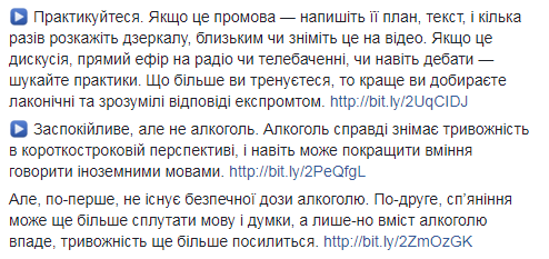 "Говорить на публике рано или поздно приходится многим из нас, и это весьма непросто. Нервничать из-за выступления перед аудиторией, особенно большой, нормально. Главное - научиться контролировать свои эмоции. Мы подобрали несколько советов, чтобы вы были готовы к публичным выступлениям", - говорится в сообщении Ульяны Супрун.