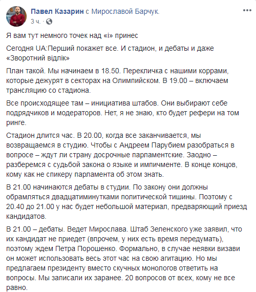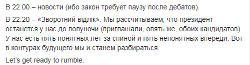 "В 22:00 – новости (ибо закон требует паузу после дебатов). В 22:20 – "Зворотний вiдлiк". Мы рассчитываем, что президент (Порошенко, действующий - прим. ред.) останется у нас до полуночи (приглашали, опять же, обоих кандидатов). У нас есть пять понятных лет за спиной и пять непонятных впереди. Вот в контурах будущего мы и станем разбираться. Let’s get ready to rumble", - говорится в опубликованном сообщении.