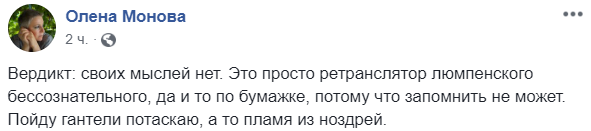 "Вердикт: своих мыслей нет. Это просто ретранслятор люмпенского бессознательного, да и то по бумажке, потому что запомнить не может", - пишет в Facebook Елена Монова..png)
