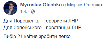 Выбор 21 апреля сделать легко", - пишет блогер Мирослав Олешко.