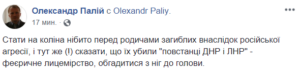 "Стать на колени якобы перед родственниками погибших в результате российской агрессии, и тут же (!) Сказать, что их убили "повстанцы ДНР и ЛНР" - феерическое лицемерие, обгадился с ног до головы", - комментирует политолог Александр Палий.