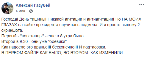 Подмену не поленились проделать в день тишины, которым официально является сегодняшняя суббота, 20 апреля. "Господа! День тишины! Никакой агитации и антиагитации! Но НА МОИХ ГЛАЗАХ на сайте президента случилась подмена. И я просто выложу 2 скриншота. Первый - "повстанцы" - еще в 8 утра было Второй в 9.30 - они уже "боевики" Как надоело это вранье!!! бесконечно!!! И подтасовки..." - написал журналист Алексей Газубей.