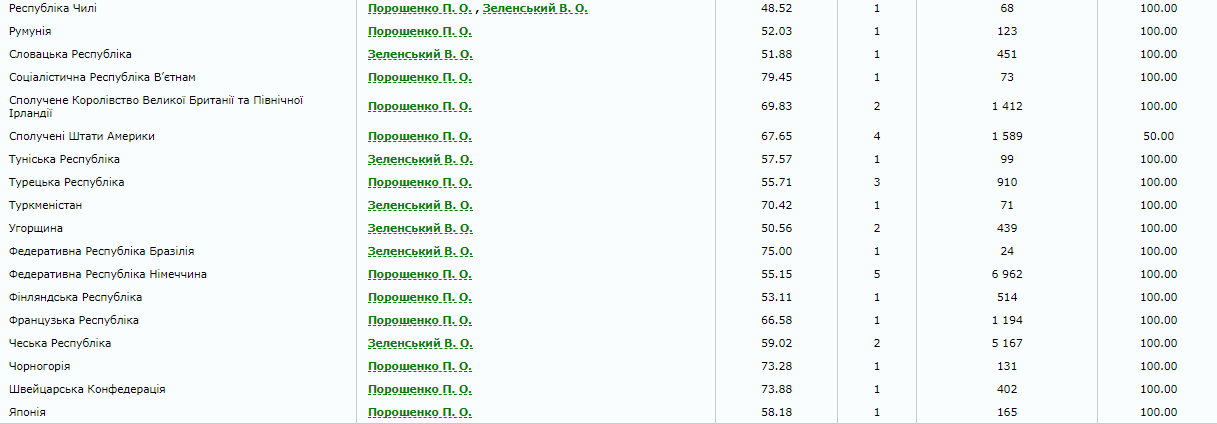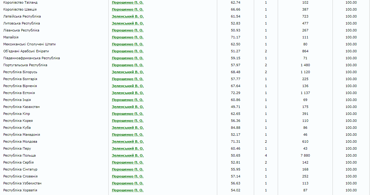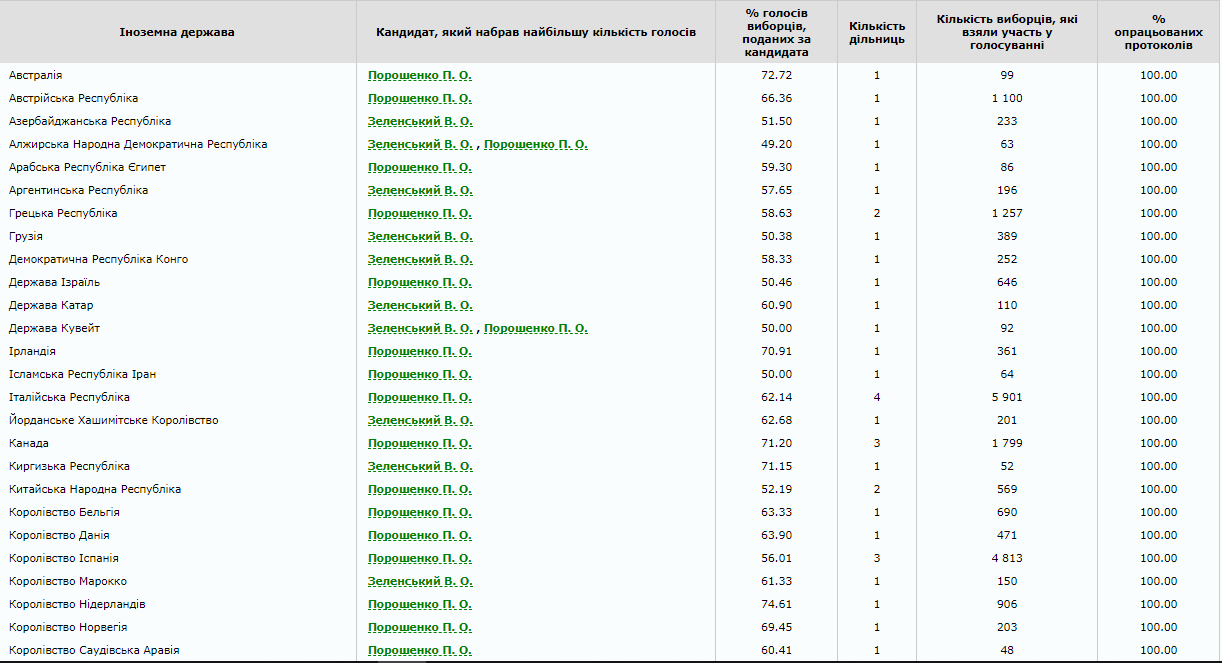 Петра Порошенко поддержало большинство избирателей на участках в 45 странах. Кандидат в президенты Владимир Зеленский победил в 23 странах. Еще в трех государствах (Кувейт, Алжир, Чили) украинцы отдали свои голоса поровну за Порошенко и за Зеленского.