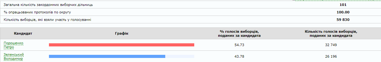 Уточняется, что за рубежом в голосовании приняли участие 57 897 украинцев. Победу на избирательных участках в посольствах Украины одержал действующий президент Петр Порошенко. Он набрал 54,73 %. А его оппонент Владимир Зеленский - 43,78%.