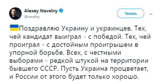 "Поздравляю Украину и украинцев. Тех, чей кандидат выиграл – с победой. Тех, чей проиграл – с достойным проигрышем в упорной борьбе. Всех с честными выборами – редкой штукой на территории бывшего СССР. Пусть Украина процветает, и России от этого будет только хорошо", – заявил Навальный.