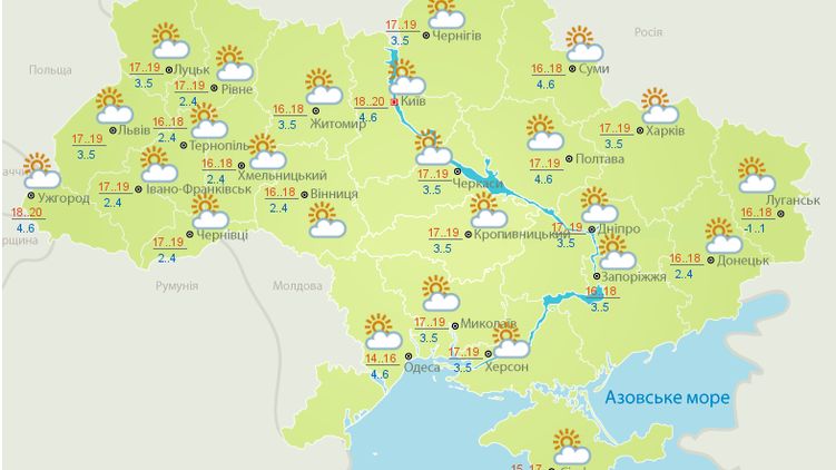 В центре Украины переменная облачность, без осадков, ветер юго-восточный, 5-10 м/с. Температура воздуха ночью 0…+6 градусов, ночью на поверхности почвы заморозки 0…-2 градуса; днем +14…+20 градусов.