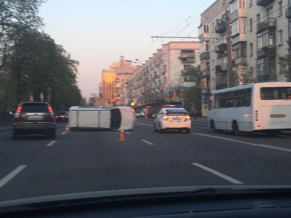 В понедельник, 22 апреля, в Киеве на проспекте Победы произошло ДТП. Посреди проезжей части перевернулся легковой автомобиль Renault. На место прибыл экипаж патрульной полиции для выяснения обстоятельств произошедшего.