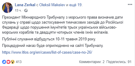 "Президент Международного трибунала по морскому праву определил даты слушаний по делу о применении временных мер к Российской Федерации о нарушении иммунитетов трех украинских военно-морских кораблей и 24 членов их экипажей. Публичные слушания состоятся 10-11 мая 2019 года", - написала она.