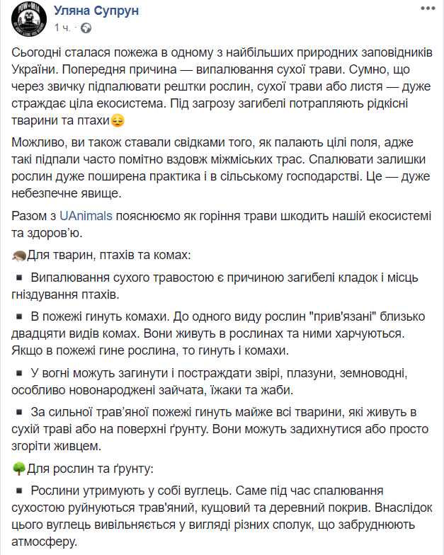 Об этом сообщила исполняющая обязанности министра здравоохранения Ульяна Супрун на своей странице в Facebook, после того, как сегодня произошел пожар в одном из крупнейших природных заповедников Украины в Ровненской области. Предварительная причина возгорания — выжигание сухой травы.