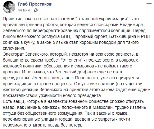 Журналист Глеб Простаков называет принятие этого закона ошибкой: "Принятие закона о так называемой "тотальной украинизации" - это провал внутренней работы, которая ведется спонсорами Владимира Зеленского по переформатированию парламентской коалиции. Перед лицом возможного роспуска БПП, Народный фронт, Батькивщина и РПЛ сбились в кучку, а закон о языке стал хорошим поводом для такого сплочения.