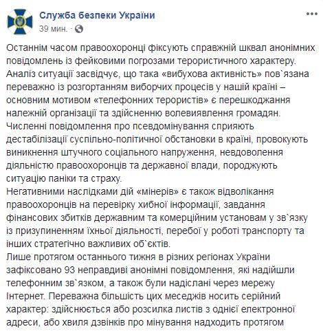 "Анализ ситуации показывает, что такая "взрывная активность" связана преимущественно с разворачиванием избирательных процессов в нашей стране - основным мотивом "телефонных террористов" является препятствование надлежащей организации и осуществлению волеизъявления граждан. Многочисленные сообщения о псевдоминировании способствуют дестабилизации общественно-политической обстановки в стране, провоцируют возникновение искусственного социального напряжения, недовольства деятельностью правоохранительных органов и государственной власти, порождают ситуацию паники и страха", - отмечают в СБУ.