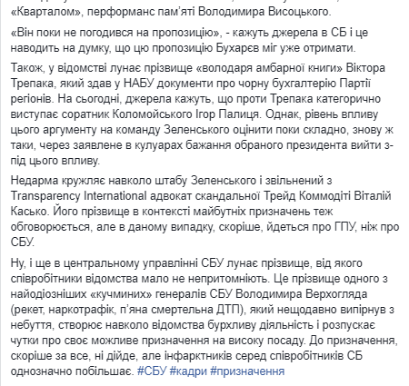 "Недаром кружит вокруг штаба Зеленского и уволен из Тransparency International адвокат скандальной Трейд Коммодити Виталий Каско. Его фамилия в контексте будущих назначений тоже обсуждается, но в данном случае, скорее, речь идет о ГПУ, чем о СБУ", - сообщает издание.