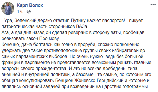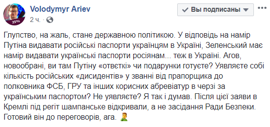 "Глупость, к сожалению, станет государственной политикой. В ответ на намерение Путина выдавать российские паспорта украинцам в Украине, Зеленский намерен выдавать украинские паспорта россиянам ... тоже в Украине. Эй, новоизбранные, вы там Путину "ответку" или подарки готовите? Представляете себе количество российских "диссидентов" в звании от прапорщика до полковника ФСБ, ГРУ и других полезных аббревиатур станут в очередь за украинским паспортом? Не представляете? Я так и думал. После этого заявления в Кремле под хохот шампанское открывали, а не заседание Совета Безопасности. Готов он к переговорам,