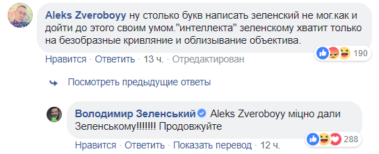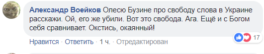 "Олесю Бузине про свободу слова в Украине расскажи. Ой, его же убили. Вот это свобода. Ага. Ещё и с Богом себя сравнивает. Окстись, окаянный!", - написал в комментариях у Зеленского журналист Александр Воейков.