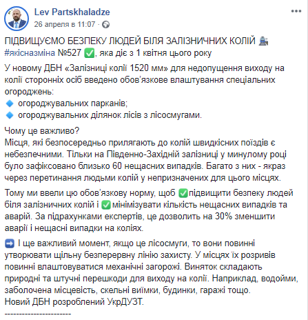 В Украине ввели нормы, согласно которым железнодорожные пути должны быть ограждены заборами или лесополосами. Об этом написал заместитель главы Минрегионстроя Лев Парцхаладзе на своей странице в Facebook.