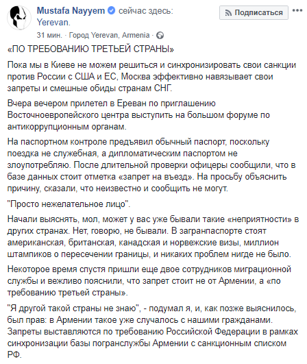 Нардепа Мустафу Найема не хотели пускать в Ереван - из-за синхронизации базы погранслужбы Армении с санкционным списком РФ. Об этом он написал на своей странице в Facebook.