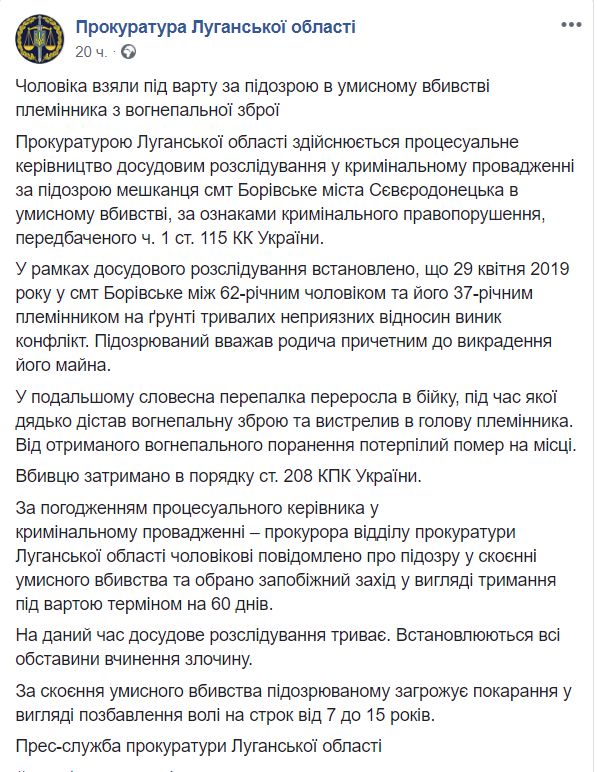 Сотрудники правоохранительных органов в Луганской области задержали 63-летнего мужчину по подозрению в умышленном убийстве племянника. Об этом сообщает прокуратура области в Facebook.