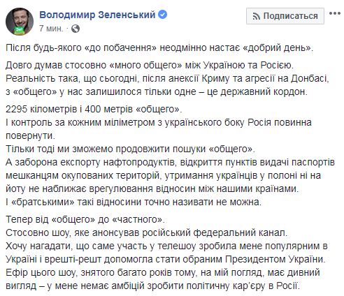 "Долго думал относительно "много общего" между Украиной и Россией. Реальность такова, что сегодня, после аннексии Крыма и агрессии на Донбассе, из "общего" у нас осталось только одно – это государственная граница. 2295 километров и 400 метров "общего". И контроль за каждым миллиметром с украинской стороны Россия должна вернуть. Только тогда мы сможем продолжить поиски "общего". ", - написал Зеленский.