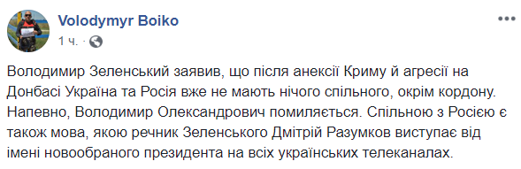 "Владимир Зеленский заявил, что после аннексии Крыма и агрессии на Донбассе Украина и Россия уже не имеют ничего общего, кроме границы. Наверное, Владимир Александрович ошибается. Общим с Россией является также язык, на котором представитель Зеленского Дмитрий Разумков выступает от имени новоизбранного президента на всех украинских телеканалах", - пишет журналист Владимир Бойко.