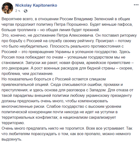 "Вероятнее всего, в отношении России Владимир Зеленский в общих чертах продолжит политику Петра Порошенко. Будет меньше пафоса, больше троллинга – но общая линия будет прежней.