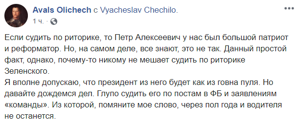 "Если судить по риторике, то Петр Алексеевич у нас был большой патриот и реформатор. Но, на самом деле, все знают, это не так. Данный простой факт, однако, почему-то никому не мешает судить по риторике Зеленского.