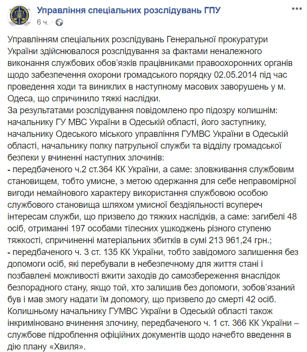 В частности, им было объявлено о подозрении по ч. 2 ст. 364 УК Украины - злоупотребление служебным положением, повлекшее тяжкие последствия, а именно гибель 48 человек, ранения 197 человек и причинение материального ущерба на сумму в 213 961,24 грн.