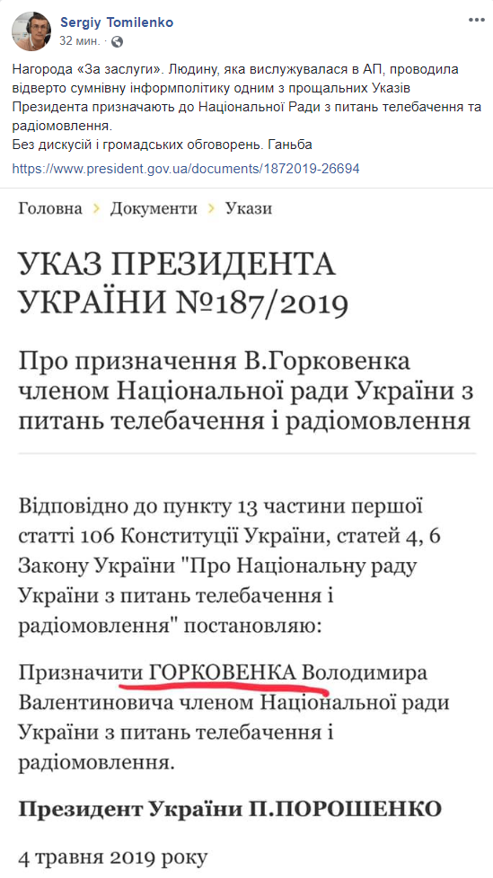 "Награда "За заслуги". Человека, который выслуживался в АП, проводил откровенно сомнительную информполитику одним из прощальных Указов президента назначают в Национальный Совет по вопросам телевидения и радиовещания. Без дискуссий и общественных обсуждений. Позор", резко отреагировал на новое назначение глава НСЖУ Сергей Томиленко.