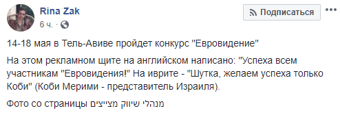 Так, пользователь Facebook выложила фото, на котором изображен баннер с надписью на английском языке "Успеха всем участникам "Евровидения!" При этом на на иврите сказано: "Шутка, желаем успеха только Коби" (Коби Мерими - представитель Израиля).