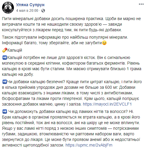Глава Минздрава Ульяна Супрун заявила, что минеральные добавки - достаточно распространенная практика. Однако необходимо консультироваться с врачом перед употреблением витаминных добавок и с осторожностью относится к БАДам. Об этом она написала на своей странице в Facebook.