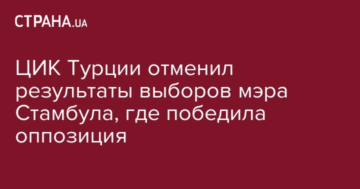 Турецкий ЦИК заявил об отмене итогов выборов мэра Стамбула, на которых впервые за многие годы победил представитель оппозиции, передает Интерфакс со ссылкой на агентство "Анадолу".