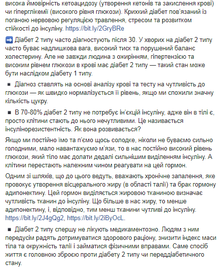 По словам Супрун, если человек постоянно ест и пьет что-то сладкое, никогда не бывает сильно голодным, мало нагружает мышцы, то у него постоянно высокий уровень глюкозы, который тело должно преодолевать все сильнее выделением инсулина. В то же время клетки перестают должным образом реагировать на этот гормон.